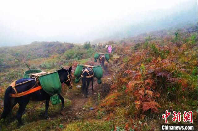 资料图:贵州金元光伏送出线路马帮驼运建设材料。贵州金元供图