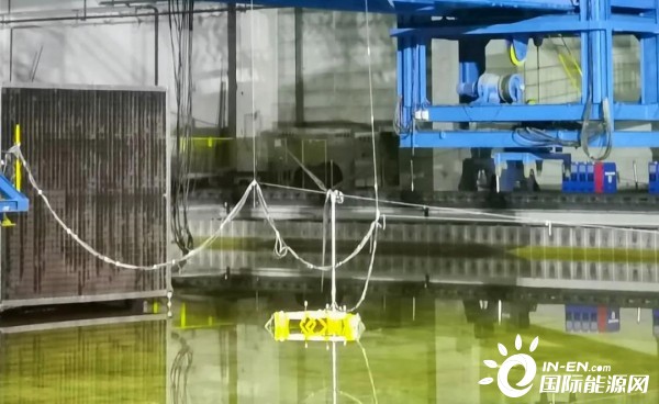 本次试验为期一周,试验采用1:64的缩比模型,模拟水深44米,完成了浮式风机衰减、系泊刚度以及风、浪、流载荷下的工况试验。测试响应与设计仿真结果基本相符。