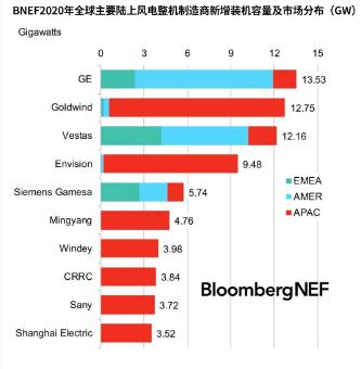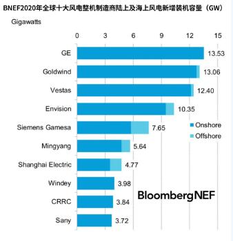 前三甲:GE、金风科技、维斯塔斯排名前三,前三家风电装机容量均超过12GW,彭博新能源财经表示,GE与金风科技借助本土市场强劲需求超过了维斯塔斯、西门子歌美飒。四到十排名: